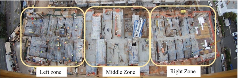 This research focuses on extracting real-time production data (start and end times) from long-term video footage of a cast-in-place concrete construction project to support real-time production system modeling. The case study involves a 40-story cast-in-place concrete project located in urban Honolulu, for which nine months of overhead video footage was available. The building is divided into three operational zones—left, middle, and right—on each floor, as shown in Figure 1. To complete a single floor, a sequence of operations is required, including: installing curb formwork, installing wall and column rebar, pouring and stripping curb formwork, installing tunnel formwork, plumbing and electrical layout, installing slab bottom rebar, rough-in plumbing and electrical systems, installing slab top rebar, pouring the concrete slab, and curing the slab.