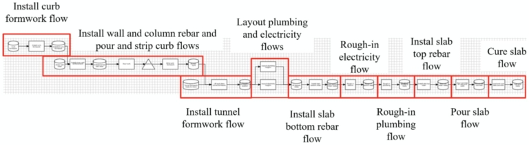 In the summer of 2024, I analyzed the production processes of a 40-story cast-in-place concrete project located in urban Honolulu. The building was divided into three distinct work zones—left, middle, and right—as shown in Figure 1. I observed and documented all operations required to complete one floor in each zone. For each zone, I identified and modeled the flow of operations and their interdependencies as production processes, with each process representing the transformation needed to produce a specific product. An example of the production process map for the left zone is shown in Figure 2.
