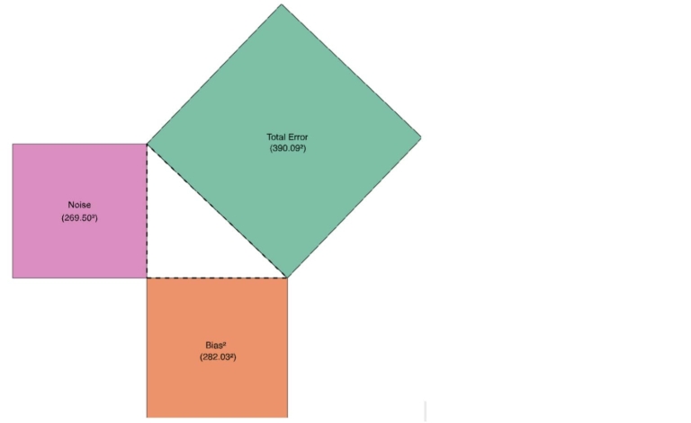 Noise and Bias are almost equally contributing to the model of explanation. The variance (0.0992) is too small to meaningfully visualize. This means that if we examine the problem solely through the lens of forecasting bias (following Kahneman and Tversky, 1979), we miss half of the total expected prediction error.